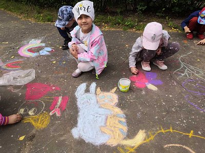 В нашем детском саду прошел конкурс рисунков на асфальте «Мир глазами детей». Дети стали настоящими волшебниками – своими рисунками превратили наши тротуары в сказочный мир. Малыши изображали свои эмоции через солнце, цветы, бабочки, ручейки, радуги, деревья, воздушные шары и др. Рисунки получились сказочными, яркими, а главное добрыми. Совместное творчество подарило множество положительных эмоций деткам и взрослым, а рисунки на асфальте продолжают радовать прохожих.