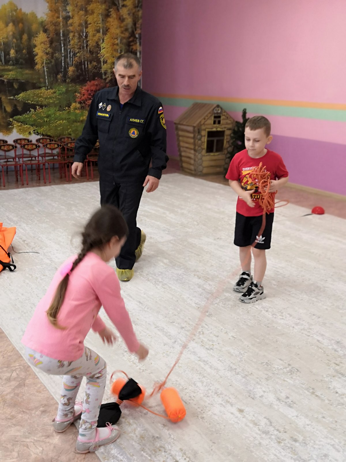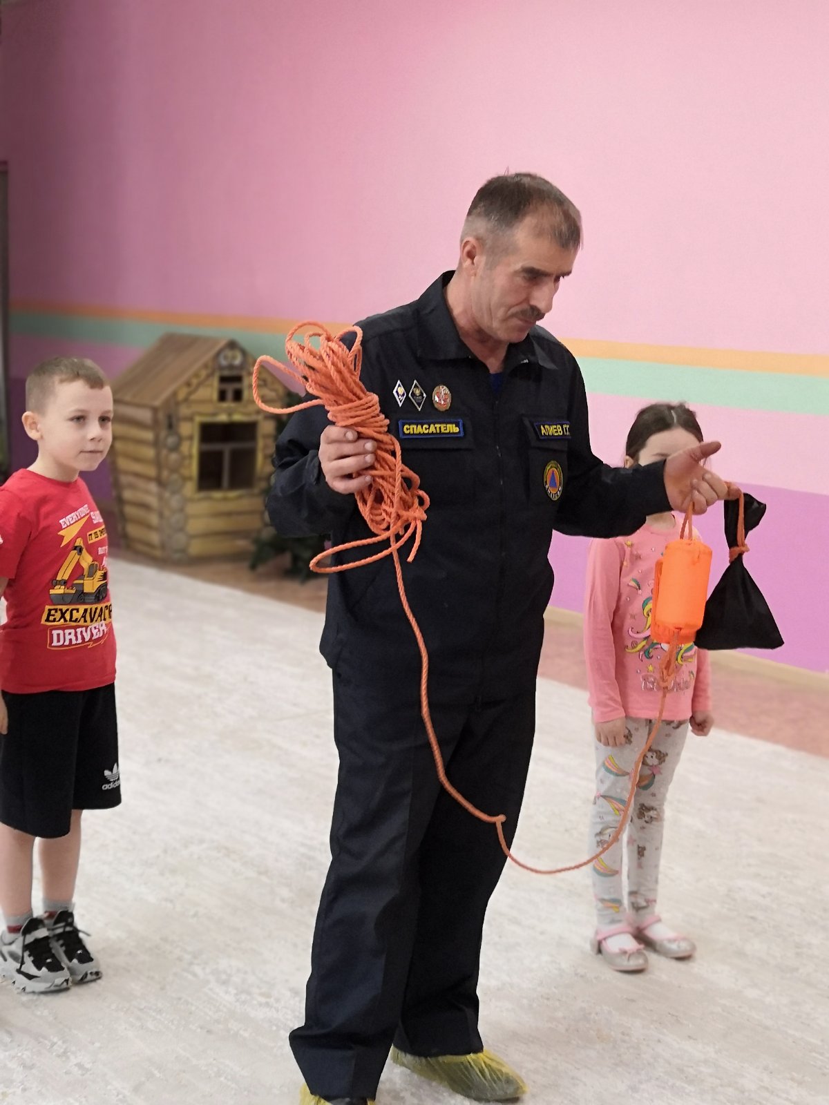 Спасатель представил наглядные средства спасения, объяснил, как правильно пользоваться каждым средством. Ребята приняли участие в практической тренировке по спасению утопающего.