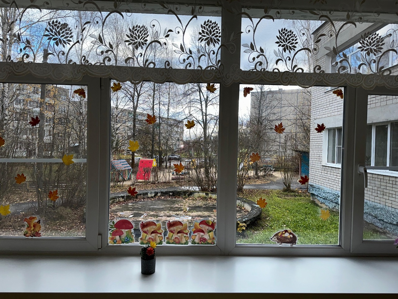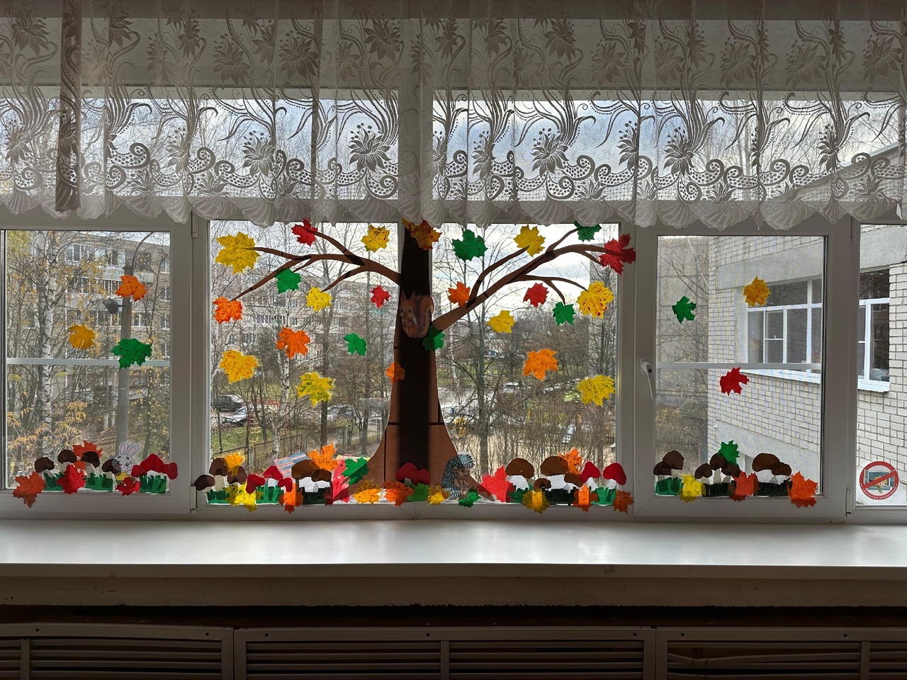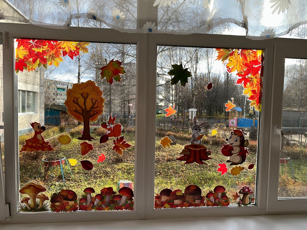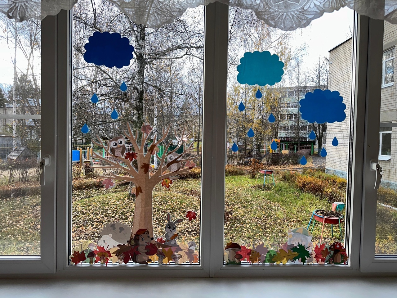 Наши педагоги решили создать теплую и уютную атмосферу в каждой группе детского сада, и осень заиграла яркими красками. И вот по окнам полетели разноцветные осенние листочки,яркие зонтики, скачет озорная белочка с грибами и веселый ежик.