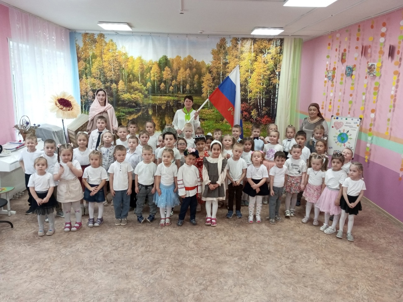 ????????Дети узнали, что Россия - великая и могучая страна, в ней проживает очень много разных народов и людей. Территория России богата лесами, полями и различными водоемами.